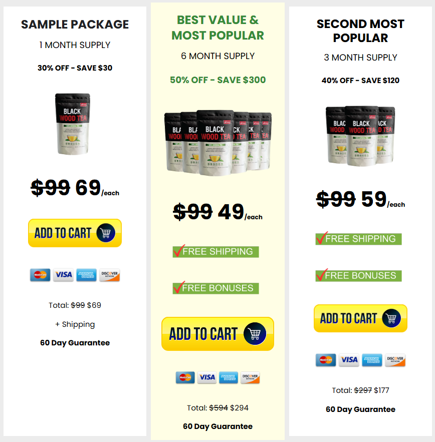 For the best results, it’s recommended to start with a 6-month supply of Black Wood Tea. Many of the most successful users have been drinking the tea for at least 6 months. While customers can order a 30-day supply to try it out, ordering larger quantities ensures better value and availability, as stock tends to sell quickly and ingredients may become harder to source.